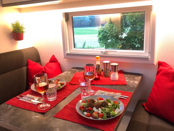 In der Osteifel machen wir den nächsten Zwischenstopp. Wir stehen auf dem Parkplatz hinter einer bewirtschafteten Wanderhütte mit phantastischer Aussicht auf die Berge und Täler der Eifel. Die Stille ist unglaublich. Wir laufen ein wenig durch die tolle Natur, sitzen abends zum Sonnenuntergang auf einer Bank und genießen den Ausblick und die Ruhe des ausklingenden Tages. Seele baumeln lassen und abschalten. Alles ist so friedlich. Der Stress der letzten Wochen und Monate scheint weit weg zu sein, auch wenn uns die Gedanken immer wieder einholen. Hier weihen wir unseren neuen Gasgrill ein – mit Christophs Eltern und ihren Freunden, bei denen sie gerade in der Ferienwohnung leben. (Vegetarische) Bratwurst im Brötchen mit Senf und dazu Kölsch aus der Flasche. Einfach, pragmatisch und unkompliziert. Das ist Camping für uns.