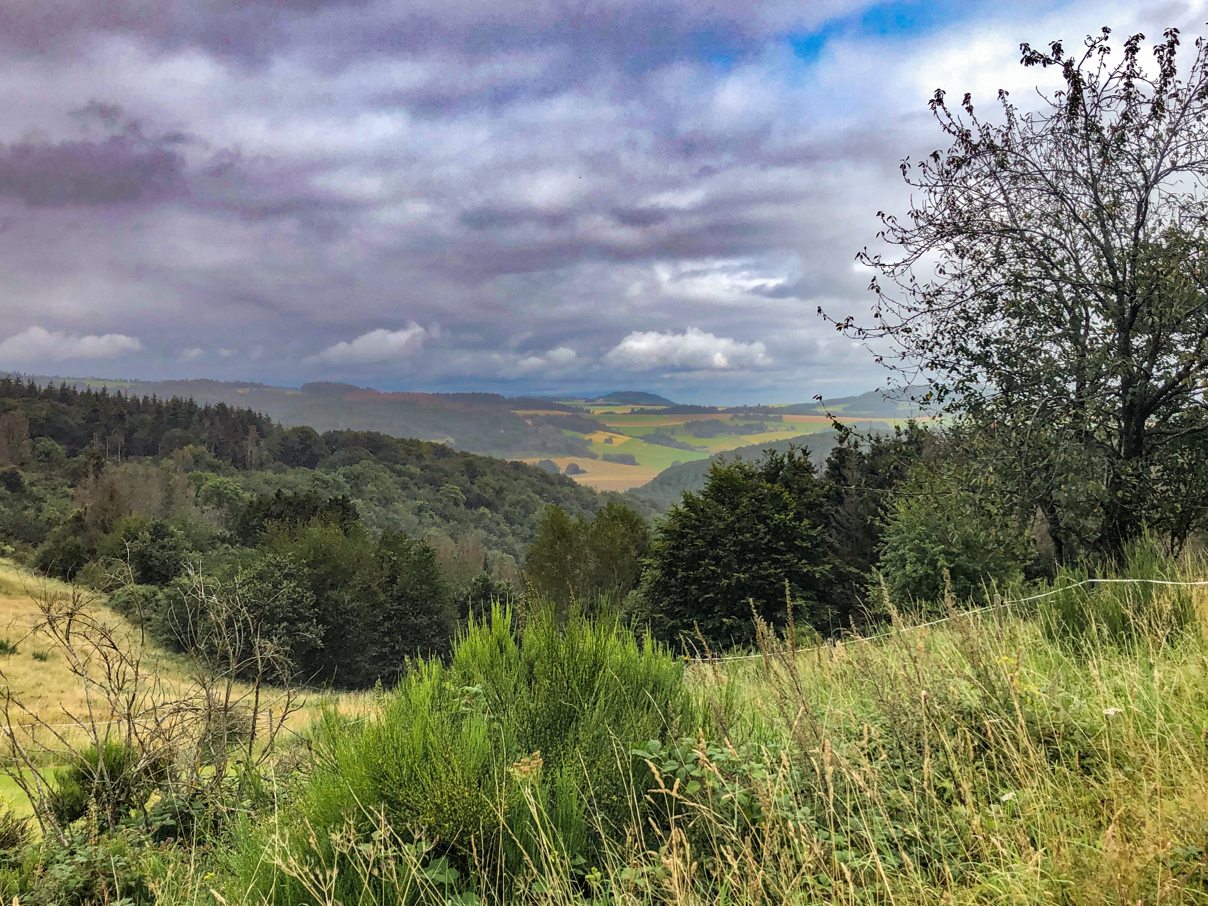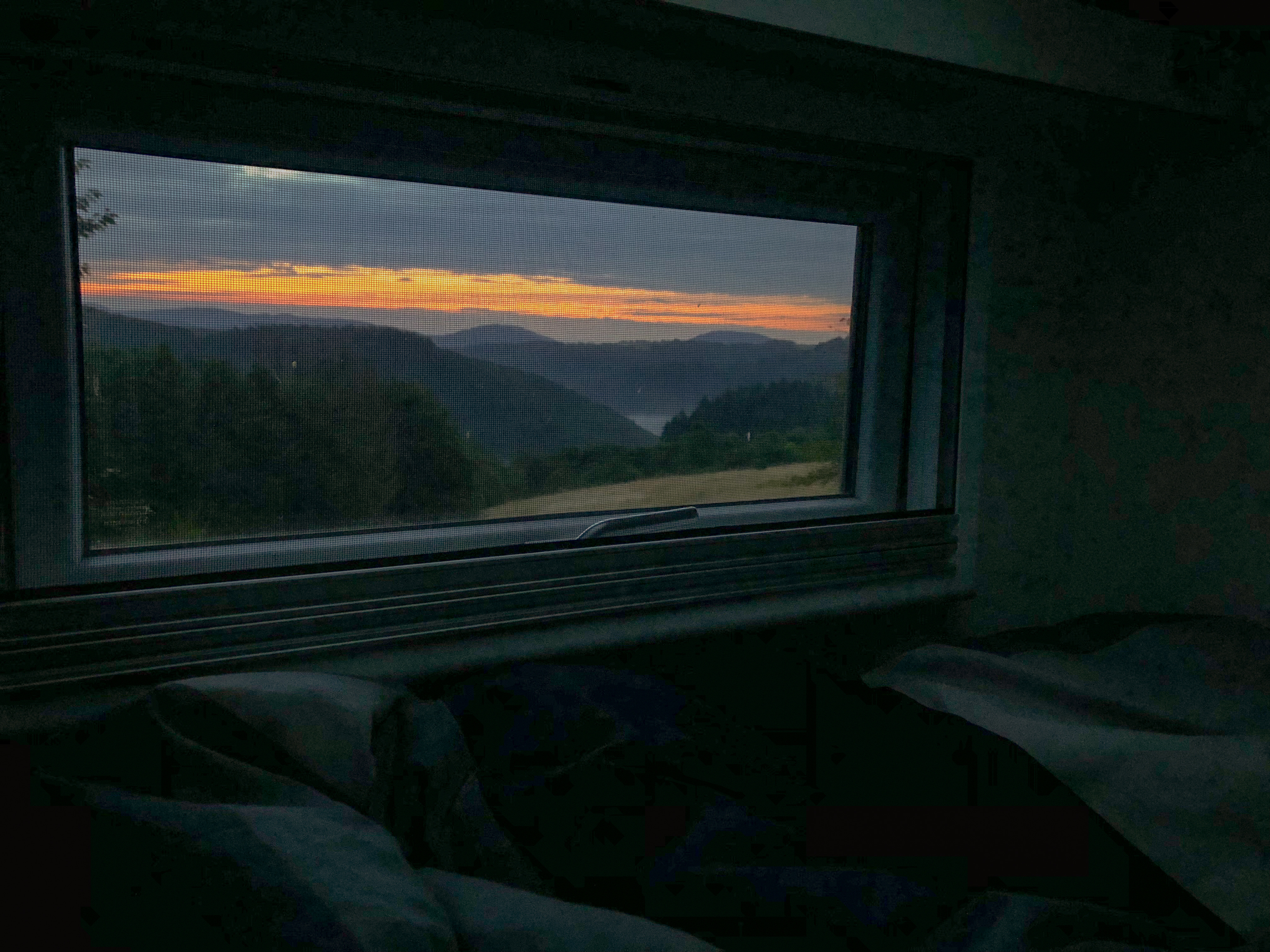 In der Osteifel machen wir den nächsten Zwischenstopp. Wir stehen auf dem Parkplatz hinter einer bewirtschafteten Wanderhütte mit phantastischer Aussicht auf die Berge und Täler der Eifel. Die Stille ist unglaublich. Wir laufen ein wenig durch die tolle Natur, sitzen abends zum Sonnenuntergang auf einer Bank und genießen den Ausblick und die Ruhe des ausklingenden Tages. Seele baumeln lassen und abschalten. Alles ist so friedlich. Der Stress der letzten Wochen und Monate scheint weit weg zu sein, auch wenn uns die Gedanken immer wieder einholen. Hier weihen wir unseren neuen Gasgrill ein – mit Christophs Eltern und ihren Freunden, bei denen sie gerade in der Ferienwohnung leben. (Vegetarische) Bratwurst im Brötchen mit Senf und dazu Kölsch aus der Flasche. Einfach, pragmatisch und unkompliziert. Das ist Camping für uns.