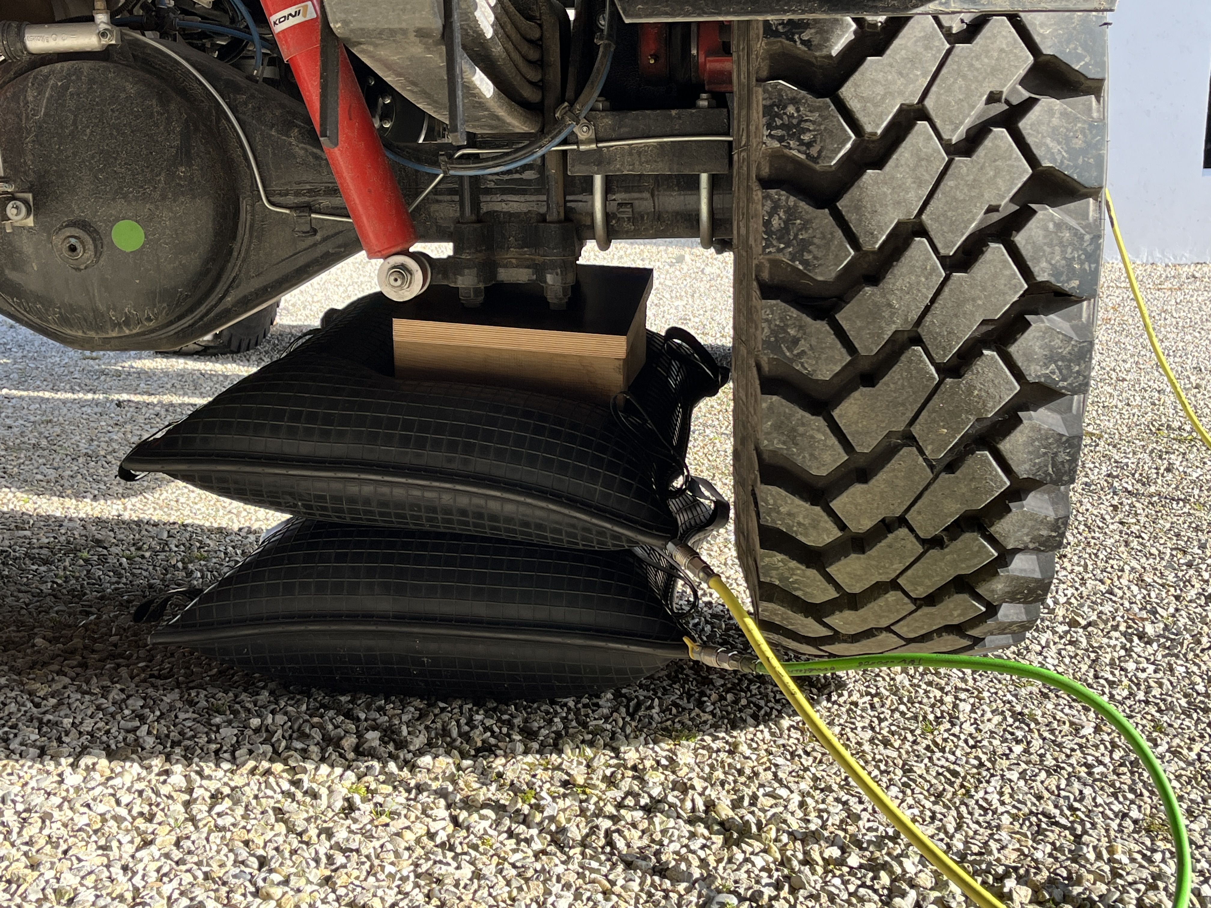 Aber jetzt ist erstmal eine Trockenübung angesagt, um im Notfall zu wissen, was wir tun. Zunächst Fahrzeug mit einem Keil gegen Wegsollen schützen – safety first. Dann die Kissen mit ihren Schläuchen an der drucklosen Regelanlage anschließen und unter der Achse positionieren. Danach den Versorgungsschlauch erst an die Regelanalge, dann bei laufendem Motor am externen Anschluss der Reifendruckregelanlage von Mzungu anschließen und dann den Luftdruckhahn öffnen. OK, beim ersten Mal haben wir es umgekehrt gemacht: Luftdruckhahn geöffnet, Schlauch angeschlossen und hektisch den Luftdruckhahn wieder geschlossen, weil der Schlauch lustig durch die Luft getanzt ist. Das hätte schmerzhaft werden können – wieder etwas gelernt. Ina positioniert noch die Kamera und jetzt werden ganz langsam die Kissen gefüllt. Einmal müssen wir kurz pausieren, weil der Luftpresser das System wieder füllen und wir das Rüstholz zum Schutz der Kissen richtig positionieren müssen. Das alles geht viel schneller als gedacht und das Zeitraffer-Video war definitiv die falsche Wahl. Nach nicht mal einer Minute schwebt Mzungu mit einem Reifen in der Luft und wir sind schwer beeindruckt. Einmal ums Auto laufen, Fotos machen, sich freuen und alles wieder wegpacken.