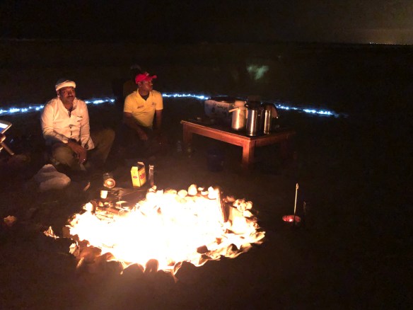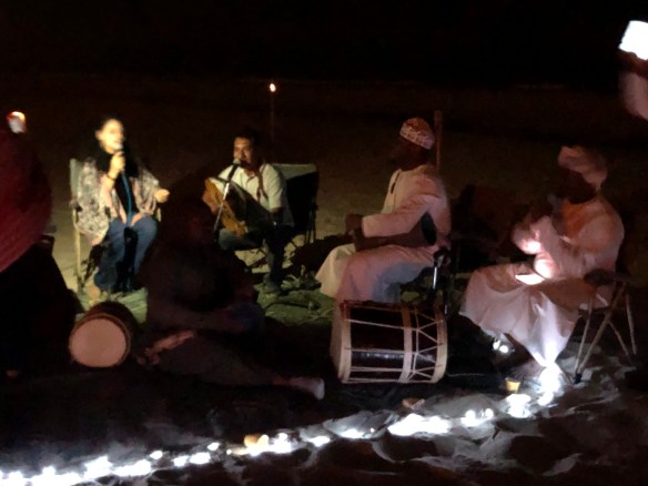 Gegen 23 gehen wir zur Silvesterparty an den Strand. Es gibt ein großes Lagerfeuer, Livemusik von einer arabischen Band, die Männer tanzen (traditionell tanzen die Frauen diese Tänze nicht, sondern nur die Männer) und immer wieder unterstützt einer (oder eine) der arabischen Gäste die Band mit Gesang. Wir sitzen auf Teppichen auf dem Boden, trinken unglaublich süßen Tee, essen Datteln und rauchen Shisha-Pfeife mit Minzgeschmack.