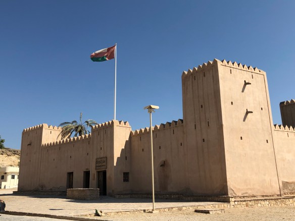 Im Osten von Salalah erreicht man zunächst im Ort Taqah (benannt nach den für den Ort typischen Fenstern) eine wunderschöne Burg, in dem der Wali, der Vorsteher des Verwaltungsbezirks, residiert hat. Die Burg ist sehr untypisch zweigeteilt, denn der Wehrturm befindet sich außerhalb, ein Stück den Berg hinauf. Heute ist die Burg ein hübsches Museum mit vielen Infotafeln, in dem man freundlich begrüßt wird. Es geht wie einigt in diesem Urlaub auch gleich um unseren Defender und unsere Reise. Als wir unseren Eintritt zahlen wollen, lehnt man ab. „Es ist Neujahr und Ihr seid so aussergewöhnlich. Wir freuen uns, dass Ihr uns besucht.“ Whow, das hat uns mal wieder beeindruckt.