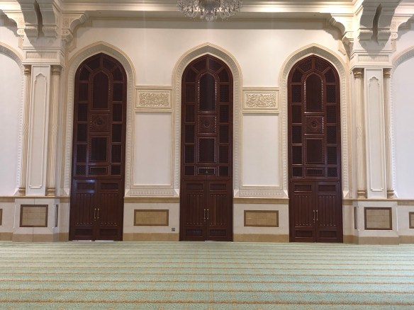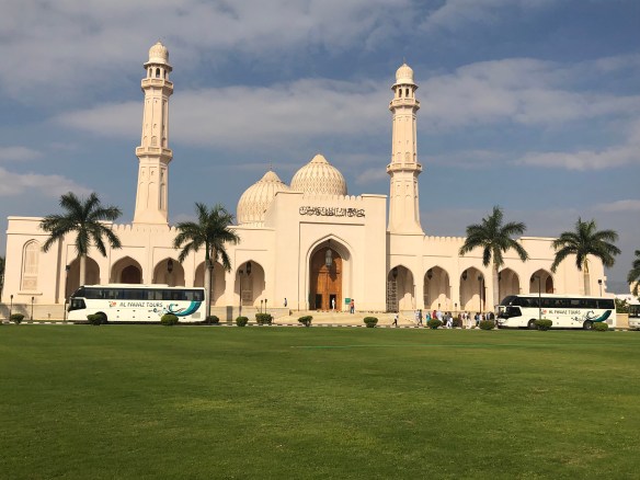 In Salalah selbst gibt es, wie in Muscat und an einigen anderen Orten im Oman, eine Sultan Quaboos Moschee, die sowohl von außen als auch von innen sehenswert ist. Viel Information rund um die Moschee gibt es leider weder in unserem Reiseführer noch in der Moschee selbst. Anders als in christlichen Kirchen gibt es in Moscheen keine Statuen oder Bilder oder sonst eine Einrichtung. Dennoch werden wir durch die schiere Größe und Erhabenheit des Gebäudes wie in einer Kirche, einer Kathedrale oder einem Dom innerlich ganz still und ruhig.
