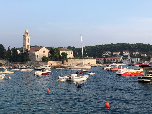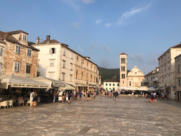 Der Ort Hvar selbst ist aufgeregt und geschäftig. Am Hafen legen ständig Passagierfähren ab und an, Ausflugsboote fahren zu den nahegelegenen Badebuchten, die nur über das Wasser zu erreichen sind, Chartergesellschaften bieten ihre Dienste an, die Jachten der Reichen und Schönen wiegen sich ebenso sanft auf den Wellen wie kleinere Boote. Junge Frauen, braungebrannt und in knappen Bikinis und muskulöse Männer vertäuen die ankommenden Boote. Es reiht sich ein Restaurant an das andere, nur unterbrochen von Andenkenshops mit den immer gleichen, mehr oder weniger sinnlosen Souveniren. Das kulinarische Preisniveau ist mindestens drei Mal so hoch wie in Albanien und die Auswahl ist zum größten Teil „touristischer Fastfood“. Wir lassen uns von dem Rummel der Stadt treiben und genießen den ausgehenden Tag.