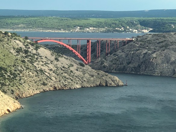 Wir durchqueren die hügelige Insel auf der einzigen Straße von Ost nach West, um zum Campingplatz hinter dem Hauptort Hvar zu gelangen. Den größten Teil der kurvigen Strecke geht es durch Wiesen, Buschlandschaft und niedrige Kiefernwäldchen. Zypressen, Weingüter und Verkaufsstände für Öl und Honig entlang dem Weg erinnern an die Toskana. Die Strecke ist insbesondere zu Beginn sehr eng und bricht ohne Leitplanken abrupt bis zu zwei Meter tief am Rand ab. Es wundert uns kaum, dass wir ein Fahrzeug auf dem Dach im Graben liegen sehen. Gott sei Dank stehen die Insassen daneben und ihnen scheint nichts passiert zu sein.