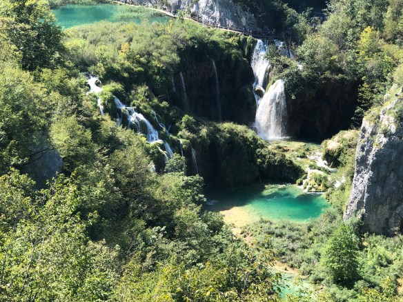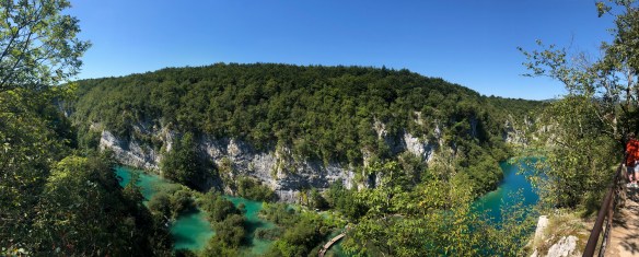 Der Nationalpark Plitvicer Seen ist UNESCO – ach, Ihr wisst schon. Der fast 300 Quadratkilometer große Park ist der älteste Nationalpark Südosteuropas. Die 16 hintereinander liegenden Seen sind über Bäche, Flussläufe, Rinnsale und Wasserfälle kaskadenartig über 130 Höhenmeter miteinander verbunden. Dazwischen wächst ein Urwald aus Bäumen, Büschen und Wasserpflanzen. Wir laufen über Holzstege und über erdig riechenden Waldboden zwischen den am frühen Morgen dampfenden Wasserflächen durch, wir genießen es, wie die Sonne zwischen den Zweigen glitzernd auf das Wasser fällt, wir nehmen eines der leise dahingleitenden Elektroboote über den Kozjak-See und fahren am Ende des hervorragend ausgeschilderten Weges mit einem Bus zum Eingang zurück. Der Park ist für uns ein absoluter Traum und wir genießen den relaxten, traumhaft schönen Tag. Einziger Wermutstropfen sind die Reisegruppen und Menschenmassen, die sich über die engen Wege schieben. Wir sind froh, am frühen Morgen ohne Anstehen im Park zu sein – am Nachmittag ist die Menschenschlange am Ticketschalter gut hundert Meter lang. Ruhe und Beschaulichkeit sind dann komplette Fehlanzeige.