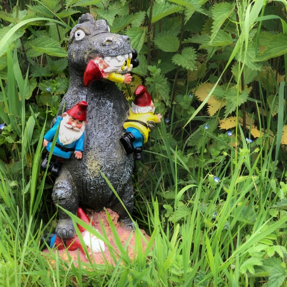 Gerade in der schönsten Idylle gibt es die räuberischsten Gartenzwerge, denen hier auch noch in Form zweier überlebensgroßer Gemälde gehuldigt wird. Die beiden Gesellen sehen in der friedlichen Atmosphäre hier zwar gutmütig aus, aber wir sind dennoch froh, dass Dino wieder über uns wacht.