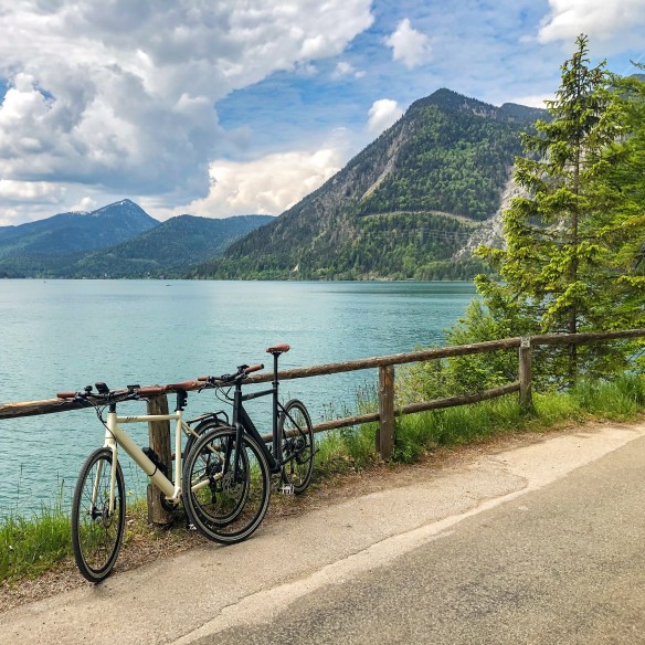 Wir haben die Fahrräder dabei und fahren über einen kurzen aber heftigen Anstieg via Kochel am See nach Urfeld am Walchensee. Die Strecke ist vielbefahrene und daher wenig lustig. Ab Urfeld geht es im Uhrzeigersinn um den Walchensee. Die Strecke ist teils gekiest, jedoch meistens geteert und geht durch Wälder, zwischen frisch gemähten Wiesen durch und fast die ganze Zeit direkt am See entlang. Autoverkehr gibt es kaum und wir genießen diesen Teil der Tour. Unterwegs gibt es einen Cappuccino und später ein Eis. Wir lassen es uns gut gehen und genießen die immer wieder herauskommende Sonne und das warme Wetter. In Einsiedl, im Südwesten des Sees gibt es einen Nachtparkplatz für Camper, den wir sicher demnächst mal mit Mzungu testen werden. Nach der wundervollen Rundtour um den See sausen wir nach einem kurzen Anstieg wieder bergab nach Kochel am See.