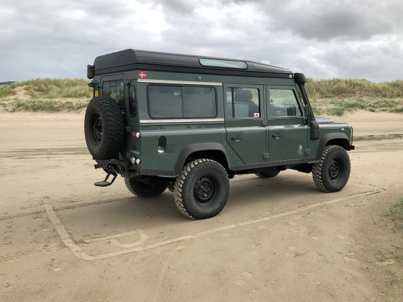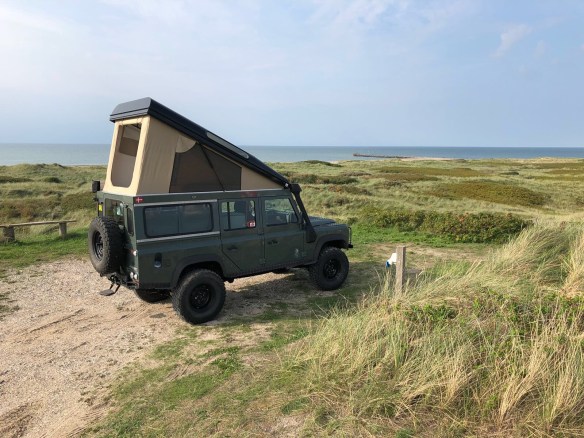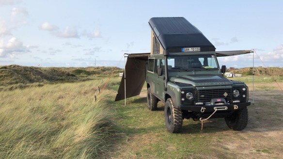 Wir fahren weiter an der Küste entlang und nehmen in Thyborøn die Fähre über den Limfjord. Die Sandzunge zwischen Meer und Fjord wurde erst 1825 von der Nordsee durchbrochen und hat die Natur stark verändert, weil aus Süßwasser Salzwasser wurde. Da wir nicht mehr auf die Fähre nach Agger passen und eine halbe Stunde warten dürfen, gibt es Kaffee und Plätzchen aus der Defender-Küche. Wir sind angekommen im Urlaub und angekommen in der Ruhe und Entspanntheit Dänemarks. In Vorupør fahren wir auf den Platz Strandgaardens Camping. Über die Sanitäranlagen schweigen wir lieber (die dringend notwendige Renovierung ist laut Aushang für 2019 geplant), aber der Platz ist wieder einmal völlig genial. Auf Empfehlung von Alexander Kneitz von der Platz-Rezeption im Supermarkt Meny entscheiden wir uns für Platz 100 und sind vollkommen hin und weg: wir haben einen Einzelplatz oben auf der letzten Düne am Ende des Platzes mit unverbautem Blick auf’s Meer. Einfach phantastisch.