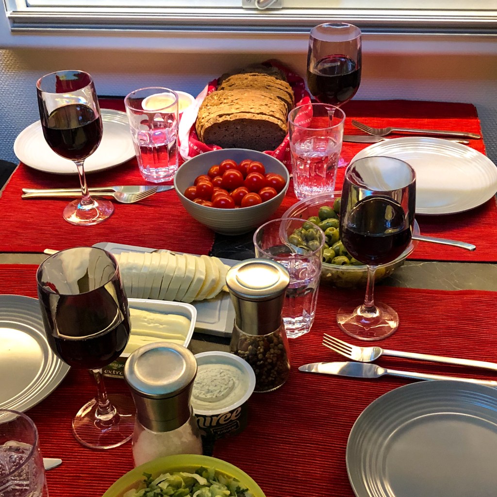 Das üppige Abendessen haben sich unsere hungrigen Mägen nach dem langen Marsch redlich verdient. Es gibt Brot, Wein, Oliven, Salat und Käse. Gekrönt wird der erste Abend mit Gästen in Mzungu von Ulrikes Apfelkuchen. Auch wenn in unserem Reisemobil alles auf 2 Personen optimiert ist, sitzt und isst man drinnen auch zu viert super gemütlich. Wir quatschen bis nach Mitternacht, tauschen unsere Reiseerlebnisse aus und diskutieren Grundrisse, Materialien sowie technische Lösungen unserer (werdenden) Fahrzeuge. Die Nacht verbringen wir mitten in der Stille der Natur.